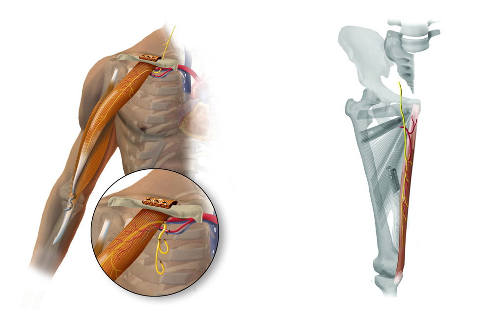 No caso, o músculo grácil é extraído e conectado no lugar do músculo bíceps. Diversos nervos e vasos que podem ser aproveitados como doadores nesses casos.