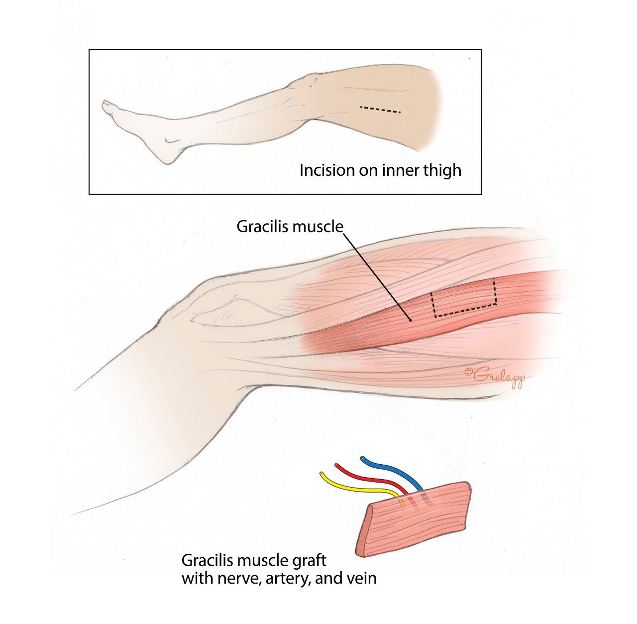 Em seguida, o músculo grácil é extraído da perna e levado para o seu novo local. Através de um microscópio, o cirurgião irá conectar os vasos e o nervo doador no músculo grácil. Em seguida o cirurgião irá conectar o músculos em seu novo sítio de atuação, conectando suas extremidades nas porções aonde quer gerar o movimento.