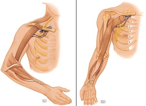 Em pacientes com lesão total do plexo braquial que já passaram mais de 1 ano da lesão, a cirurgia de nervo não é mais eficaz. Também não há músculos próximos que possam ser usados para recuperar algum movimento. O que se faz muitas vezes é realizar o transplante de músculo para recuperar a capacidade de dobrar o cotovelo.